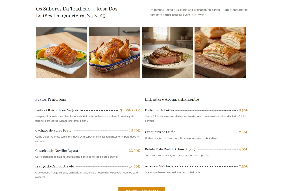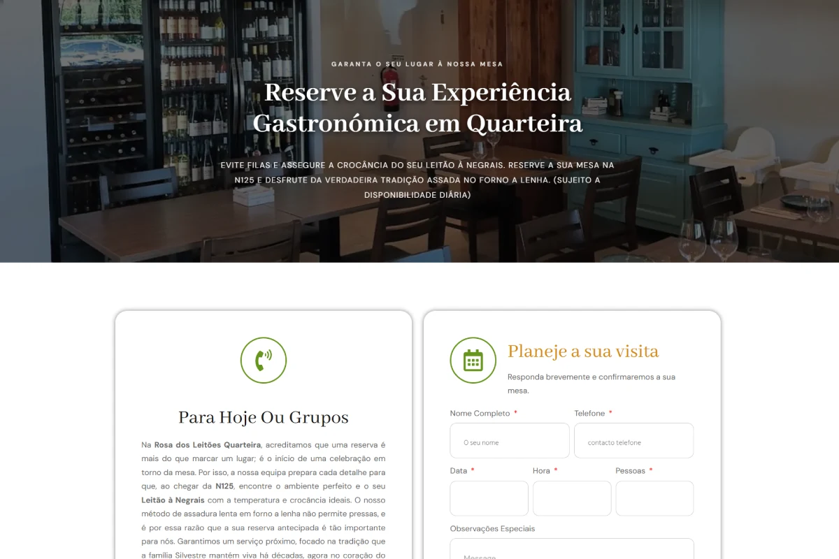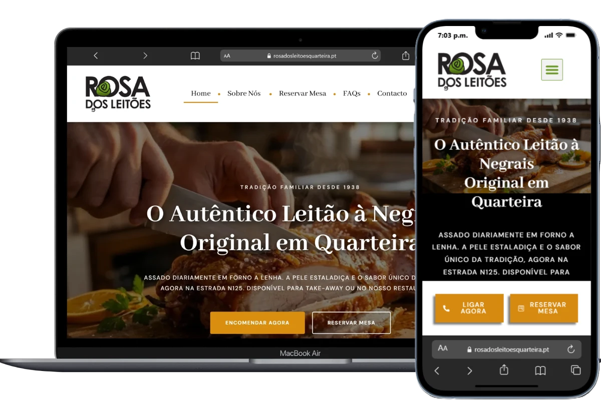 Hero section do website Rosa dos Leitões em Quarteira, exibindo o autêntico Leitão à Negrais assado em forno a lenha com botões de reserva e encomenda online.